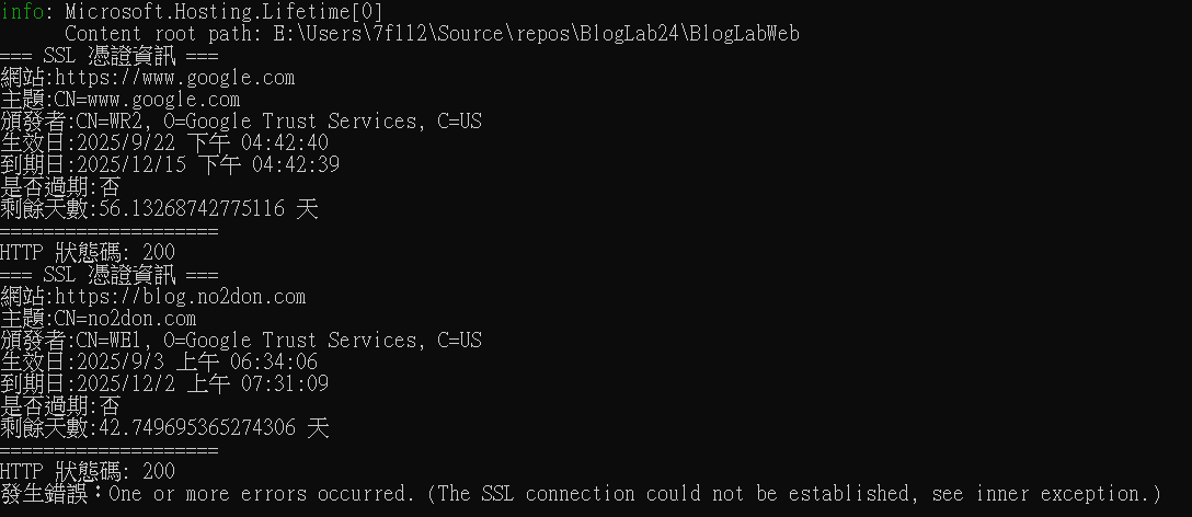 Console.WriteLine("=== SSL 憑證資訊 ===");
